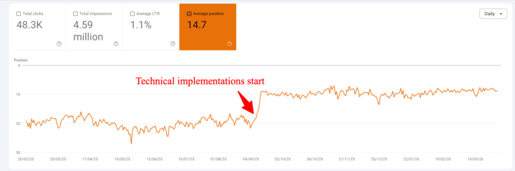 RESULTS: The objective was to recover average search positions lost on Google. We successfully restored these rankings by implementing comprehensive technical SEO solutions.